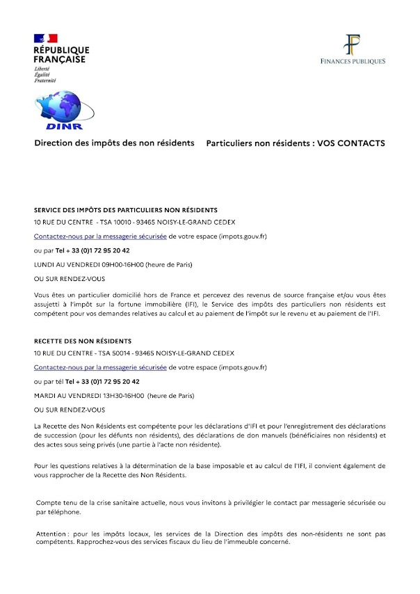 Direction des impôts des non résidents: Le site contient de nombreuses informations pour vous aider dans vos déclarations. Créez votre espace personnel et utilisez la messagerie sécurisée pour vos échanges avec l'administration fiscale. Leur compte facebook officiel propose des informations régulièrement et fort utiles.